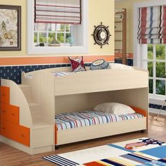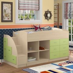 Кровать-чердак "Дюймовочка-4/3" рассчитана на двоих детей, так как объединяет два полноценных спальных места. Выдвижная нижняя кровать может устанавливаться в удобном положении для сна в ночное время и убираться в дневное время. Под кроватью имеется ящик для белья и открытые ниши. В лестнице предусмотрены выдвижные ящики для хранения вещей. Такой уголок экономит пространство в детской комнате. Кровать подойдет детям от 2 до 18 лет.