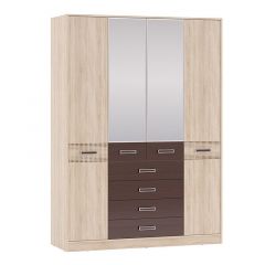Разместить большой гардероб вы сможете благодаря четырёхстворчетому шкафу Фиеста. Модель выполнена из ЛДСП в комбинации цветов венге и лоредо, две створки являются зеркальными. Внутреннее наполнение состоит из большого центрального отделения со штангой для верхней одежды и вещей на вешалках. Справа и слева от платяной зоны находятся полки. Фасады оснащены эргономичными ручками. Шкаф всегда можно добавить другими модулями из одноименной мебельной серии.